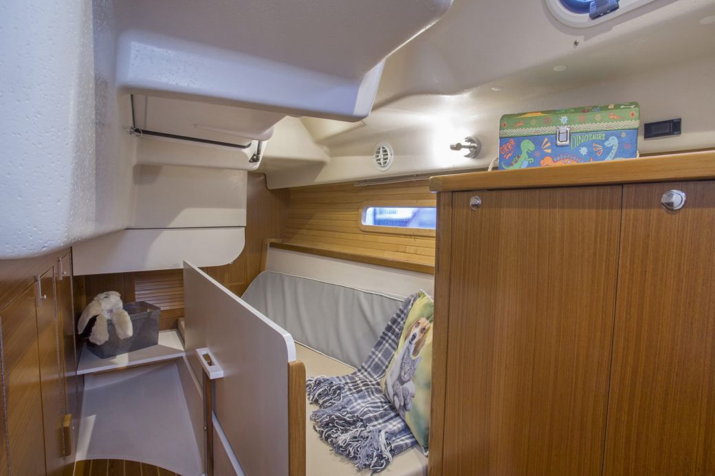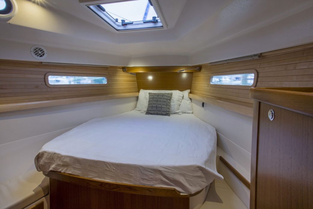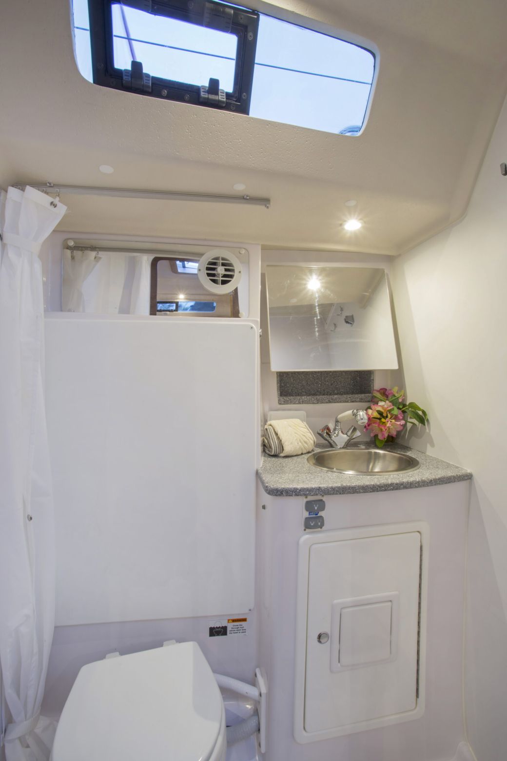 This yacht has three spacious, the master forward cabin features a queen-sized island berth with abundant storage, while the en suite head offers a separate shower stall and a modern, upmarket feel. The port aft cabin features a unique convertible sea berth for extra storage and provides easy access to the steering assembly and through-hull fittings. Inner spring mattresses come standard in the forward and starboard aft cabins, ensuring a comfortable night’s sleep on Sydney Harbour.