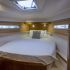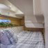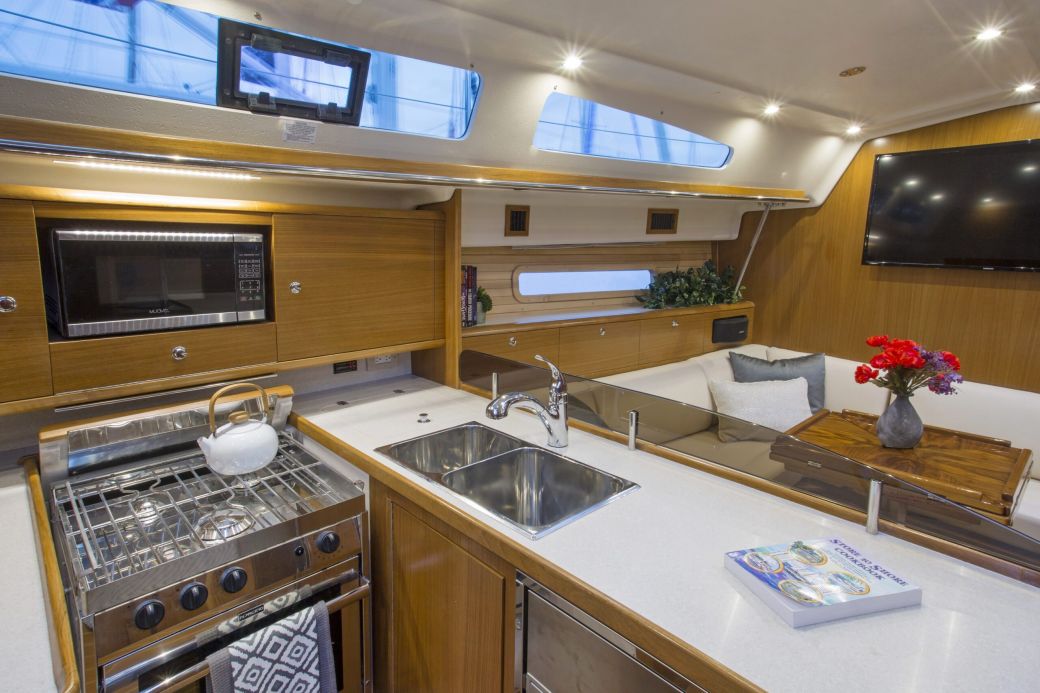 Below deck, this yacht is all American luxury, designed for comfort and convenience. Abundant natural light and ventilation flood through numerous opening ports and hatches, while angled wood companionway steps ensure safe and easy access. The L-shaped galley provides ample storage, with Corian bench tops and wood trims offering plenty of space for food preparation, large front opening fridge, double sinks and stove with oven and grill.