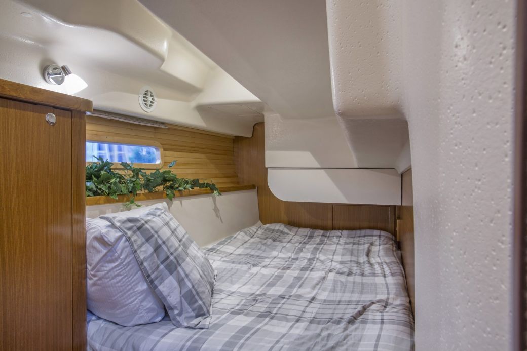 Moving forward through the salon is safe and easy, thanks to full-length steel grab handles within easy reach. The expertly crafted varnished teak interior exudes elegance and sophistication, with signature bench seats that convert to a full-length settee and plush seating around the folding high-gloss dinette. The teak and holly laminate floor provide a traditional look, adding to the yacht’s allure.