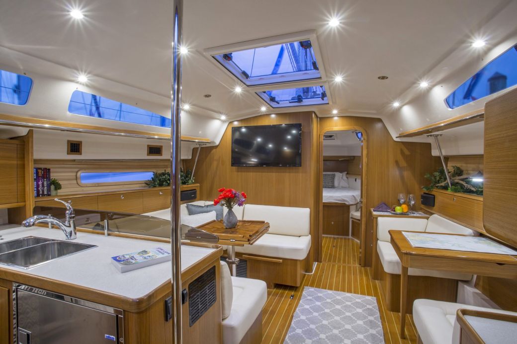 Under sail this yacht is fun and exciting, beautifully balanced and super easy to handle. The In Mast Furling Mainsail and Self Tacking Jib are simple to use and ensure the decks are clean and uncluttered with ropes.